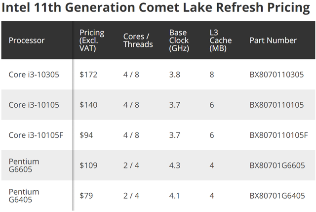 Tiếp đến là giá bán của CPU Core i3 trở xuống (kiến trúc Comet Lake Refresh). Được biết những CPU này phần lớn vẫn sẽ giống với CPU Comet Lake, riêng xung nhịp thì sẽ được cải thiện. 2Compute bán Core i3-10305 và Core i3-10105 với giá lần lượt là 172 đô và 140 đô, cao hơn phiên bản tiền nhiệm 6,8% và 4,5%.