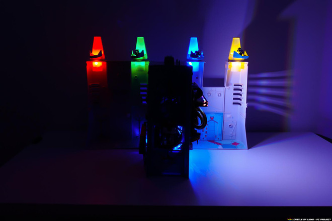Các mảnh lâu của tòa lâu đài được bao bọc bên ngoài case PC, vẫn giữ được các góc cạnh bo rất hợp lý. Chính giữa (trái tim lâu đài) là một chú robot sư tử đen đang ngậm nút nguồn power.