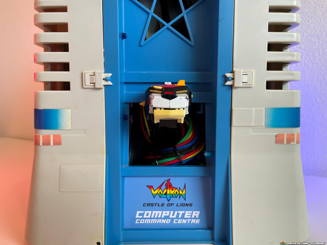 Mở nội thất bên trong máy còn chất hơn nữa. Các mảng màu và thiết bị phần cứng được bố trí đúng kiểu đưa tác giả về lại tuổi thơ cùng Voltron. Theo đó, 4 chiếc SSD với 4 màu khác nhau, tượng trưng các mảnh ghép sư tử (cùng sư tử đen ban đầu) để hợp thành robot Voltron khổng lồ.