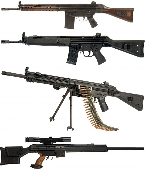 G3 (ở trên cùng) và những thiết kế tiêu biểu dựa trên G3. Từ trên xuống là súng trường tấn công HK33, súng máy HK21 và súng bắn tỉa PSG-1.