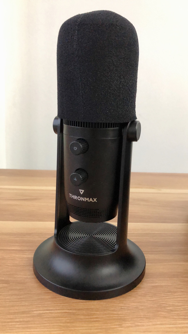 Mặt trước của Thronmax Mdrill One có 2 nút vặn, cho phép người dùng tinh chỉnh được mức độ to nhỏ và độ nhạy khi thu âm.